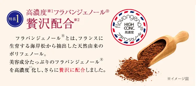 ※1 従来のフラバンジェノール®より特長物質を多く含むフランスカイガンショウ樹皮エキス(保湿成分)のこと