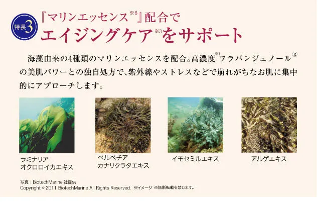※6 ラミナリアオクロロイカエキス、ペルベチアカナリクラタエキス、イモセミルエキス、アルゲエキス(全て保湿成分)のこと