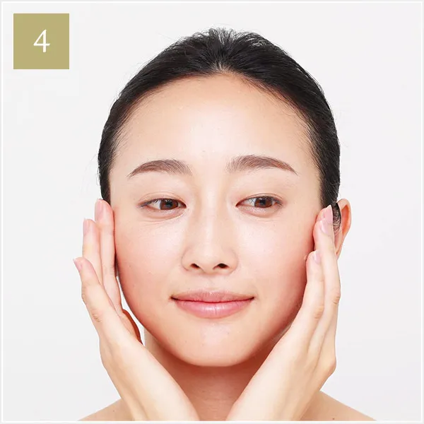 指先で、ほほは下から上へと持ち上げるように、ひたいは大きく円を描くようにすべらせます。