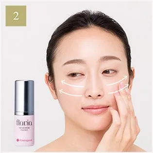 ポンプ1〜2プッシュを目安に、エッセンスを手のひらに取ります。両ほほ、額、あごにエッセンスを指全体を使ってのばし、顔の中心から外側に向かってなじませます。